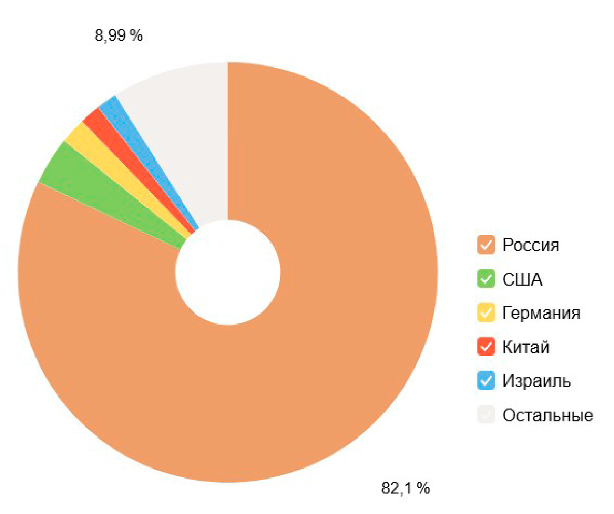 Но реальная статистика аналитической системы «Яндекс Метрика» показывает пёструю карту: Россия – 82,1 % пользователей, США – 3,72 %, Германия – 1,98 %, Китай – 1,63 %, Израиль – 1,59 %, другие страны – 8,99 % (рис. 1). То есть представители других стран составляют практически пятую часть аудитории! Сайт «Невы» посещают пользователи из Беларуси, Казахстана, Финляндии, Болгарии, Сербии, Польши, Нидерландов, даже читатели из Колумбии, Индии и Ирака с Малайзией заглядывают на огонёк.